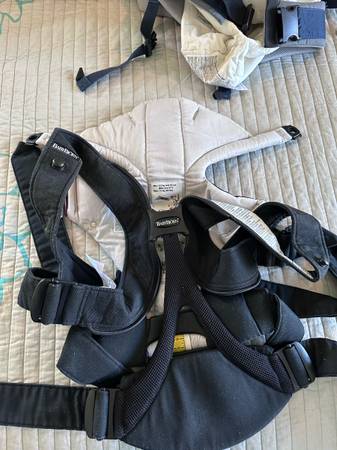 1. BabyBjorn baby carrier: black, adjustable, lightweight. Has a multitide of adjustable options. Like new- barely used as we prefered the Ergo Baby carrier. Price is$25
