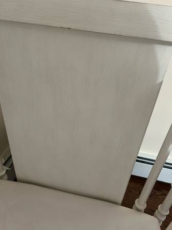 Bed is wood and the color is a French Antique White- it’s meant to look like a distressed antique so it’s not a smooth white finish. Look at the closeup photos for color.
