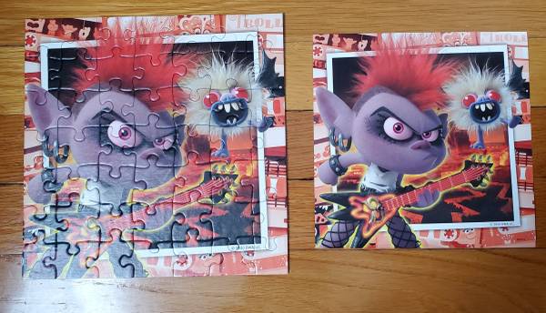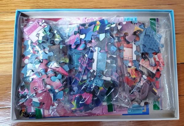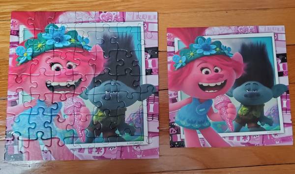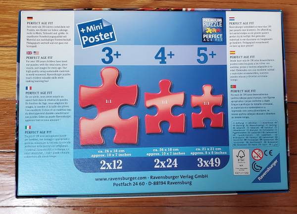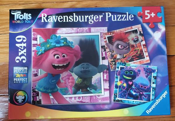 This is a well kept puzzle set. 3 different puzzles with all the pieces and individual pictures to help. I kept them in separate ziplock bags, however if they ever get mixed up, they have patterns in the back of each puzzle piece, so you can easily separate them. Great to keep kids busy.
