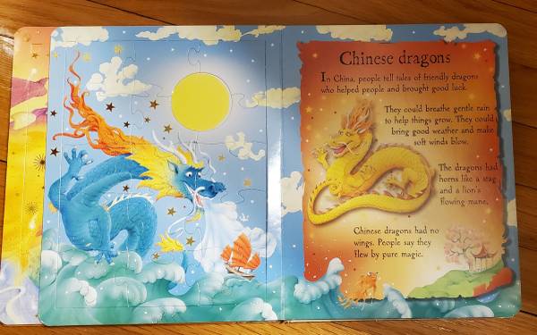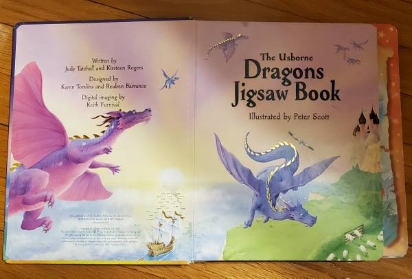 Beautiful Dragons book with 6 colorful vibrant puzzles within the book. Each puzzle ranges from 15-16 pieces. Outside cover has some imperfections, like edges worn or what looks like scratches....