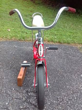Has banana seat, raised handlebars, and gleaming chrome fenders!