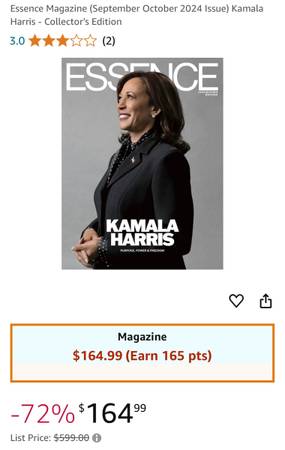 This is a must-have for any collector of rare and hard-to-find magazines. The September/October 2024 issue of Essence features Kamala Harris on the cover and is a special edition item. It is a variant cover and only made available to limited newsstands, making it a unique addition to any collection. Historical and collectible! The magazine is written in English, the page count is 96 and there is no barcode or mailing label.