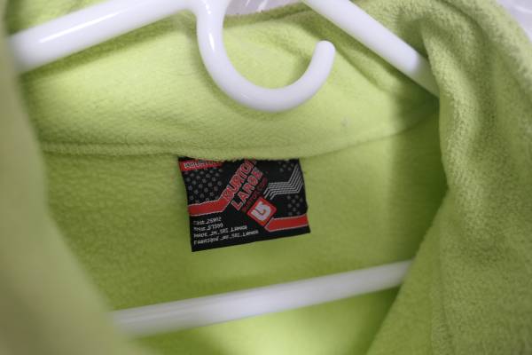 Large size. Roomy fit. I'm 5'11 180 lbs and it can be worn over a sweater. Bright yellow green color so that you stand out in the white snow. Excellent condition as I wore it once while walking my dog.
