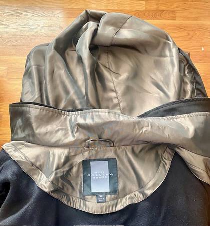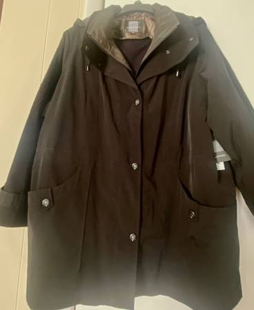 Black women's plus 3x jacket. Never worn. Full zipper closure with snap overlay. Interior drawstring waistband, two exterior pockets, one chest pocket. Inside zipper lining is removable, as well as detachable hood. By Miss Gallery Woman, orig. retail $175.