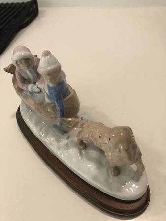 Vintage Porcelain 9" Paul Sebastian Meico Sleigh Ride kids, boy, girl, dog on sled figurine in a winter wonderland