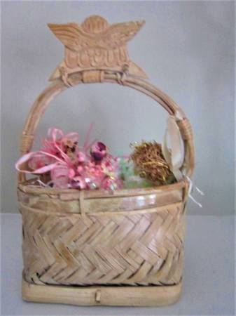 10 YEAR OLD BASKET WITH EGGS, DRAINED, COLORED AND DECORATED (3), BASKET CONTAINS WHITE GRASS. BEAUTIFUL PIECE FOR HOLIDAYS. EGGS ARE NOT CRACKED. INSIDE OF EGG DRAINED AND COMPLETED IN CRAFT CLASS.