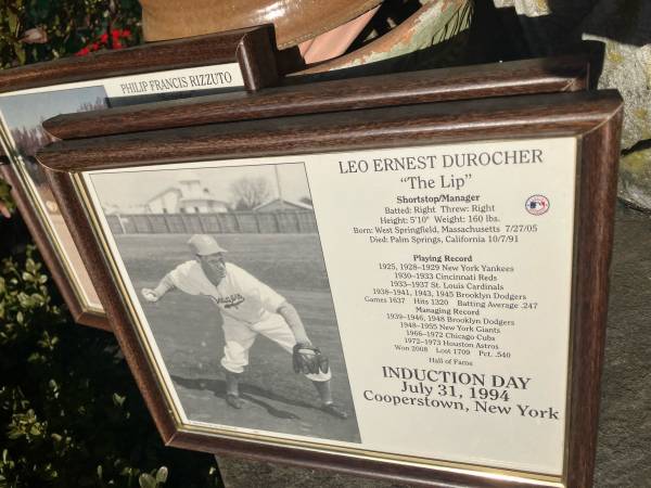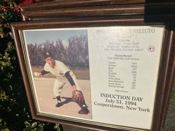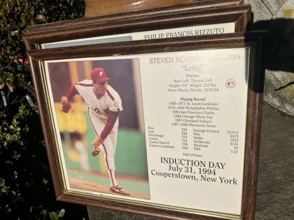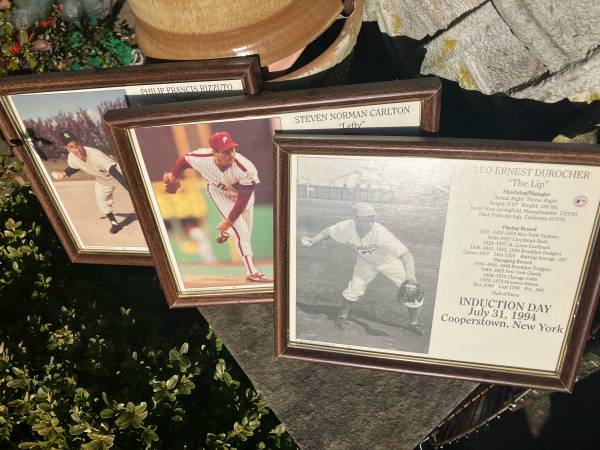 Three framed superstars of baseball history. Framed color photo and stats of Steve Carlton, Phil Rizzuto and Leo Durocher (B/W) from Cooperstown NY souvenir shop. Dated July 31, 1994. Hung in our basement bar for 30 years and none the worse for wear.