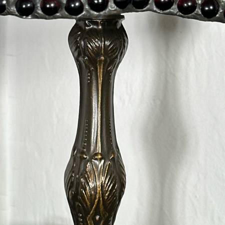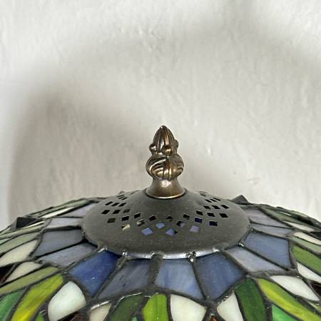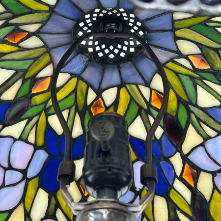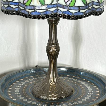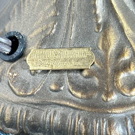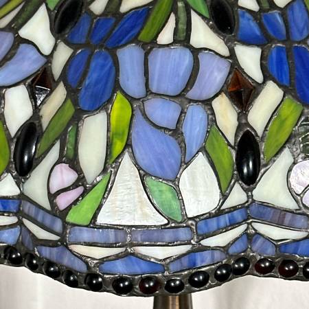 Tiffany style stained glass table lamp, featuring a slender brass base and a stained-glass shade with blue and green colored florals, resembling irises. Marked on base: "Antiques Roadshow Collection by Dale Tiffany, Inc." - h. 20 x w. 14 in.