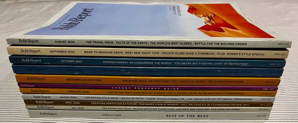 Get your hands on the complete collection of Robb Report Magazine's back issues from August 2024 to July 2025. Immerse yourself in the world of luxury travel, lifestyle, and business with this highly sought-after set of publications. Filled with stunning photography and insightful content, these magazines are a must-have for any collector or enthusiast.