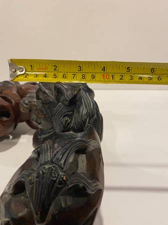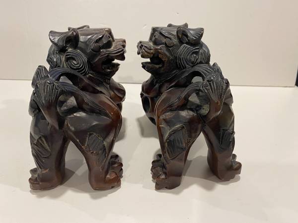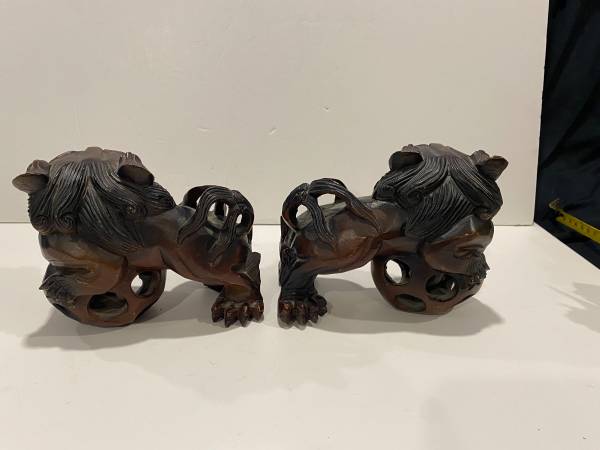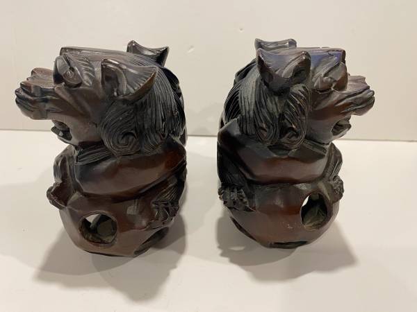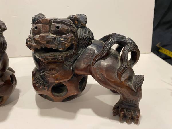 Vintage Asian Hand Carved Wooden Guardian Foo Dogs Floating Balls Inside 7” long x 5.5” high some scrapes