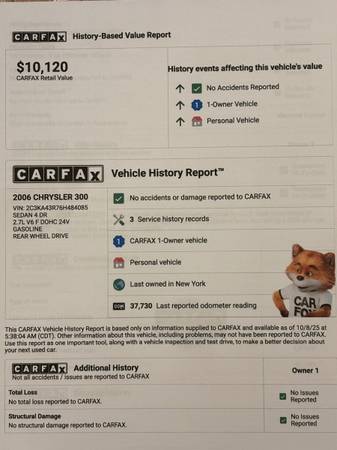 2006 Chrysler 300 Van, automatic, original owner, 37,730 miles, 2.7L V6 engine, rear wheel drive, air conditioning, power windows, power door locks, cruise control, power steering, tilt wheel, power seat, AM/FM/CD/MP3 single disc audio system, steel wheels, vehicle in excellent condition inside and out, everything is working, clean CarFax, no accidents, all maintenance up-to-date, all tires and brakes in excellent condition. $10,500 OBO.