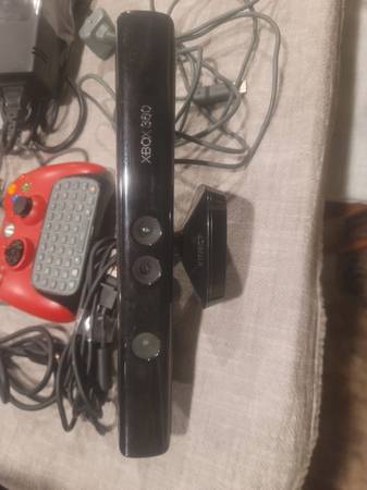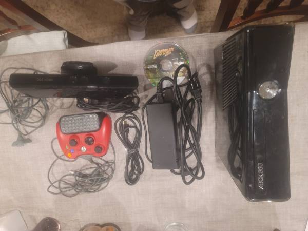 XBOX 360 S console with Kinect Camera Bar 1 Controller with Keyboard, battery and cord 1 Kinect Adventure Game 1 power block 1 HDMI cable to connect to TV 1 extra controller cord