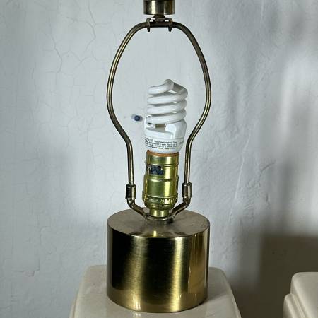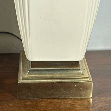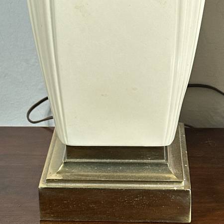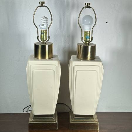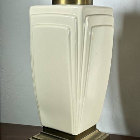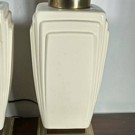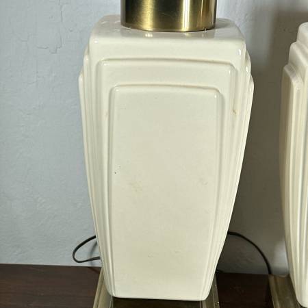 Pair of vintage (1950s) Stiffel "Art Deco Revival" style table lamps, with ivory ceramic stepped design bodies and cast brass bases. - h. 27 x w. 7 in.