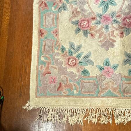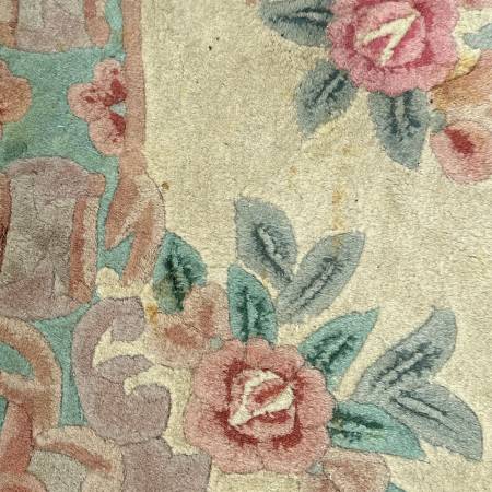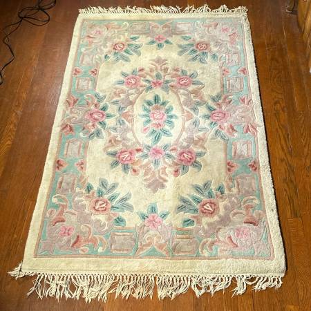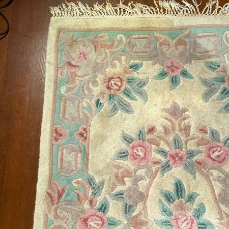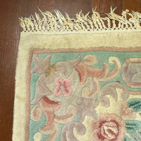 Vintage light pink wool area rug with an elegant floral design and fringed ends. - w. 42.5 x l. 66 in.