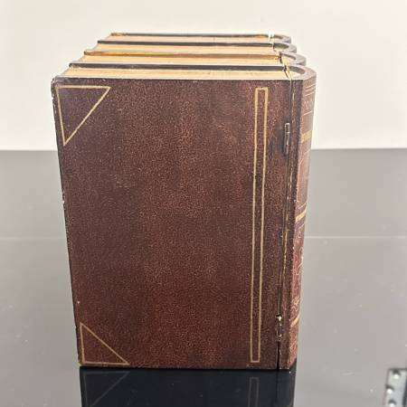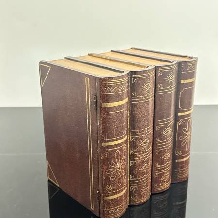 Hideaway box, designed to resemble a stack of four old leather-bound books, with two rear doors that open to reveal a secret storage compartment. - h. 8.75 x w. 8.5 x d. 6.5 in.
