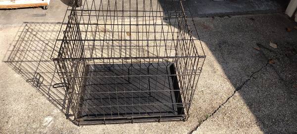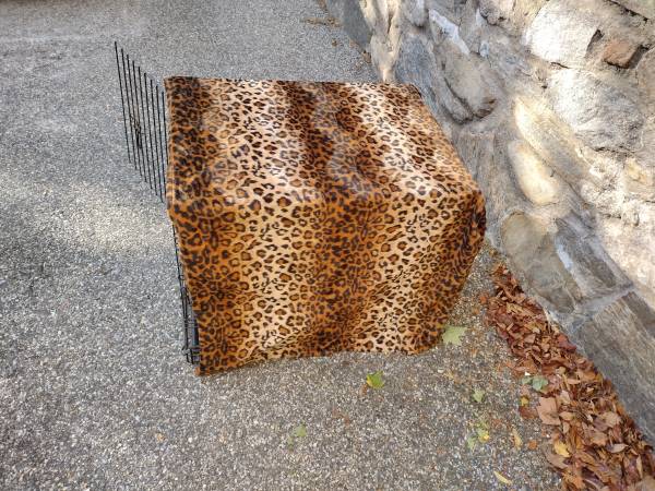Folding dog crate with pillow, drape and bumper in leopard print. Very good condition. some surface oxidation from storage. lot's of life left in it
