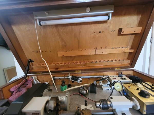 This is a one of a kind unimat lathe work station I designed and had make for me many years ago by a very skilled cabinet maker. It is on rubber heavy casters to protect fine flooring as it was designed to be in living space and "hide" among furniture. It almost looks like a small piano or maybe more like a desk.