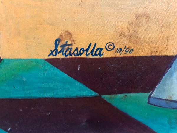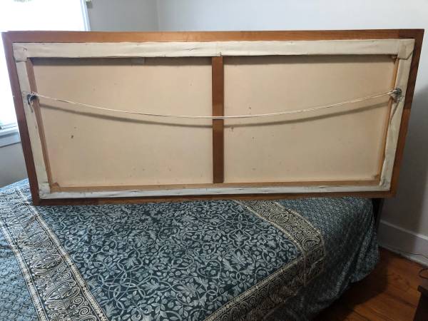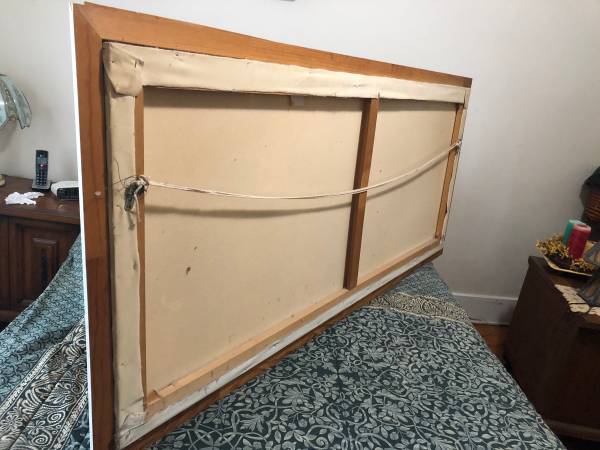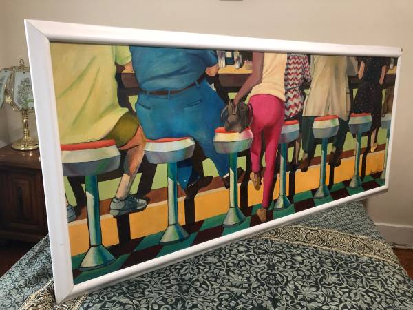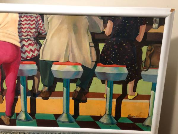 Here's this wonderful retro oil canvas wall painting from the iconic Thru Way Diner in New Rochelle. This was painted by Mario Stasolla a famous art director / commercial illustrator and designer from New York City. It measures 6 feet 4inches long by 2 feet 10 inches wide with a wood frame and is dated October 1990. There's a minor blemish on the top right side white plastic. Perfect for a collector or food service business owner Below you will find links all about the artist & diner. Still available, $900 cash...local pickup only Thanks for viewing my ad. :-)