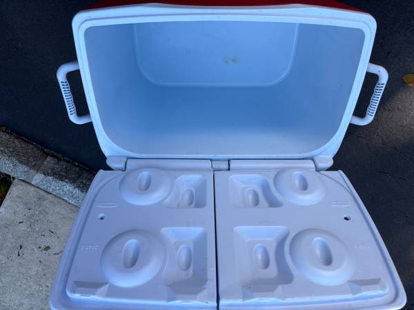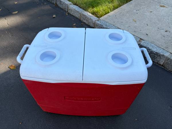LARGE Rubbermaid 50 qt Insulated Modern Red Cooler Ice Chest Built In Cup Holders in Lid