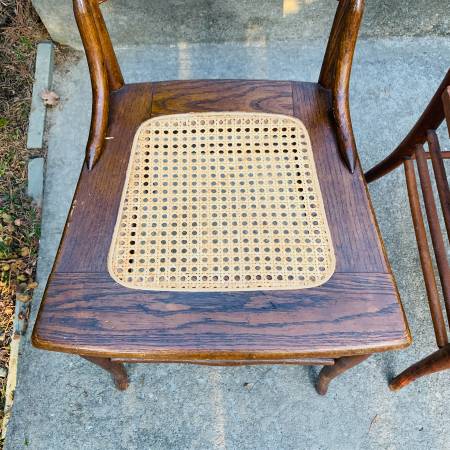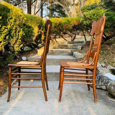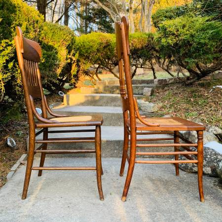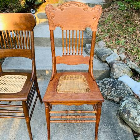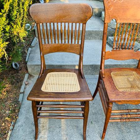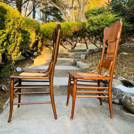 Pair of Early 20th Century Antique Oak Press Back Cane Seat Dining Chairs