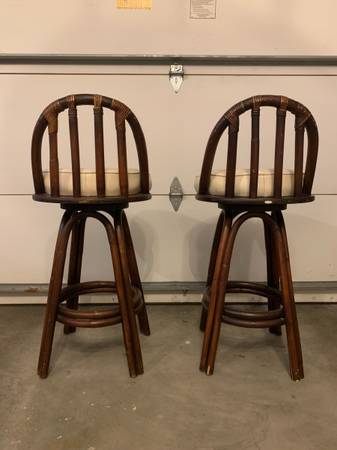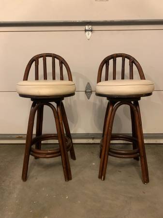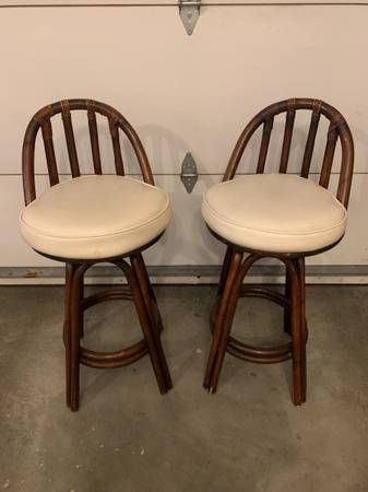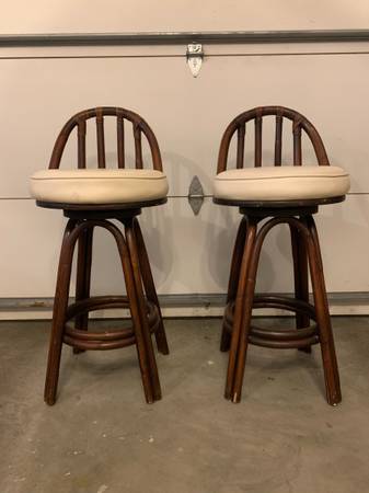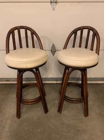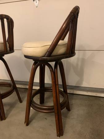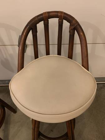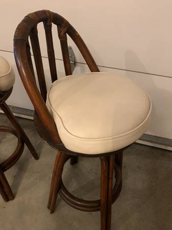 Vintage 1950s Kalp-Son Rattan Co. Elegant Mid-century Rattan Bamboo Cane Caned Bentwood Tiki Bent Wood Bar Stool Swivel Cushion Chairback Bar Chairs $250 each THEY ARE IN VERY GOOD USED...