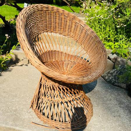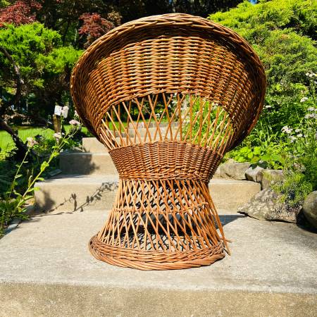Vintage Mini Peacock Rattan Wicker Barrel Bucket Egg Chair Woven Lounge Chair 1960s, 60s, 1970s, 70s, Panton, Knoll, George Nelson, John Jeliff Herman Miller, Arne Jacobsen, Harvey Probber, Karl...