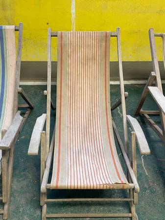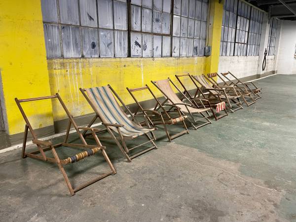 Collection of 8 vintage beach chairs from France, wood and canvas with armrests.