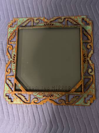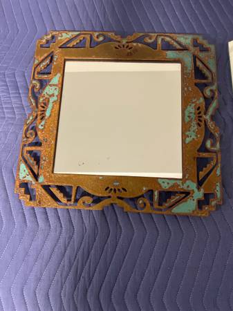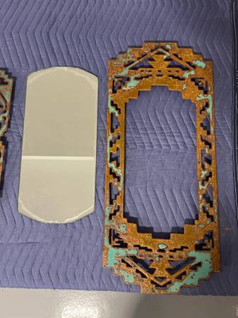 Unique and eye-catching, this pair of heavy painted metal frames feature a bold Southwestern design and a naturally distressed look. Originally painted in turquoise over a bronze-tone base, both frames have aged beautifully, showing surface rust and oxidation that adds authentic vintage character.