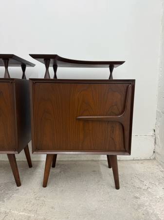 A striking pair of mid century modern walnut sculptural nightstands, c. 1960s.
