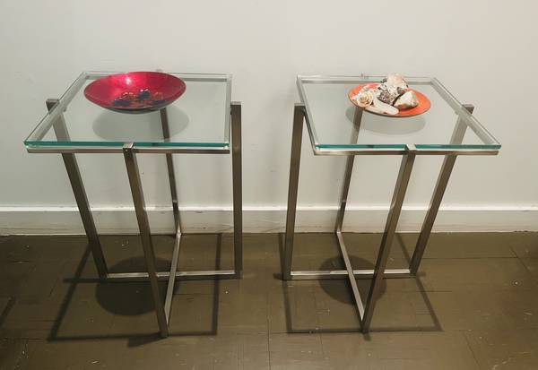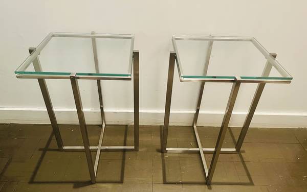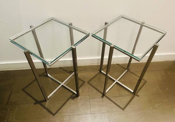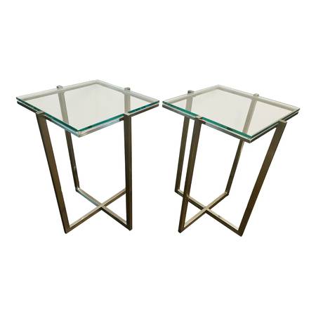 For that sleek mid century glam appeal, this pair of chrome and glass side tables are waiting for you. In the style of Milo Baughman, each measures 19.5" tall x 14" x 13.5" Glass tops are removable....