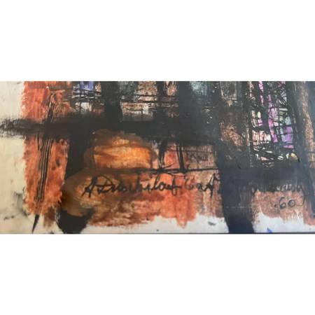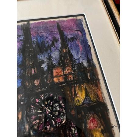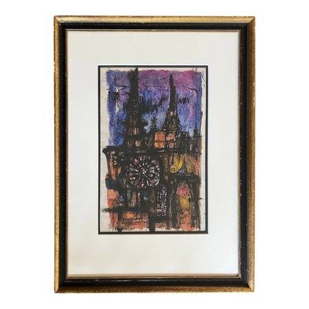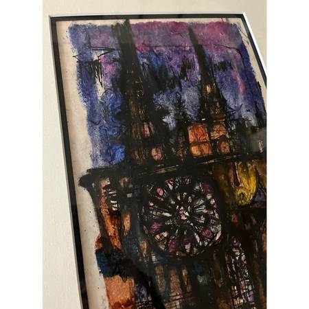 This lush, signed work offers a colorful view of a gothic church somewhere in Europe. Combination of paint with pen and ink. Someone who knows their gothic churches may be able to guess this one. Signed and dated lower right. Measures 20" x 14.5". ready to hang. Presented under glass in a gilt wooden frame with black accent, professionally framed and double matted in sand tone. 1960