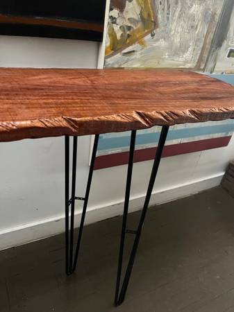 Stylish live edge console table hand crafted from red oak. Mid century style iron legs with a semi gloss finish. Lots of organic character and ample surface space for your decorative objects, mail and car keys. Measures approximately 55" wide x 12" deep x 29" tall.