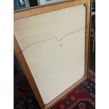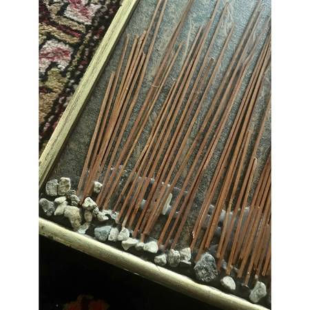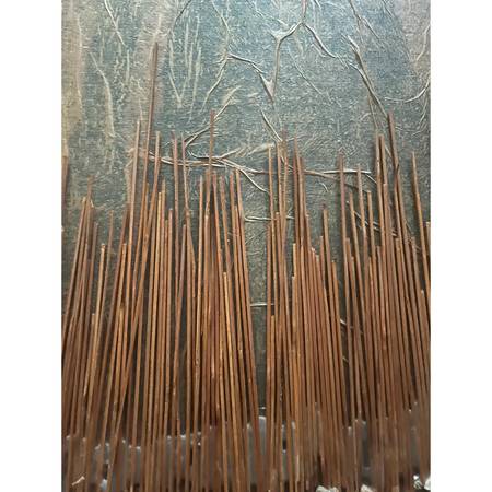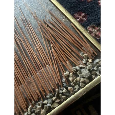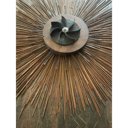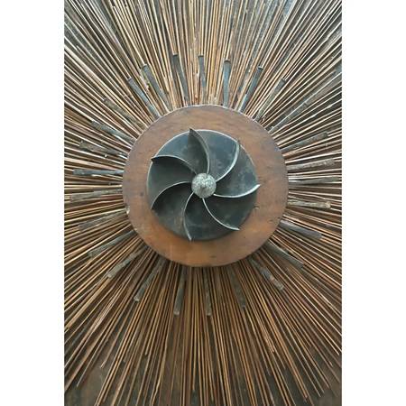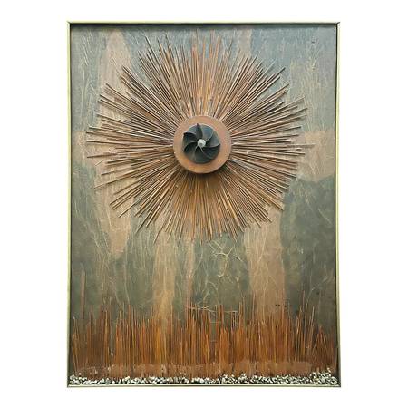This 1970's work is truly a wonder. Combines natural elements such as stones and dried reeds with industrial metal to create a vision of the sun. Presented in a gold toned wooden frame, measures approximately 41" x 31". Unique one of a kind work of art. Ready to hang.