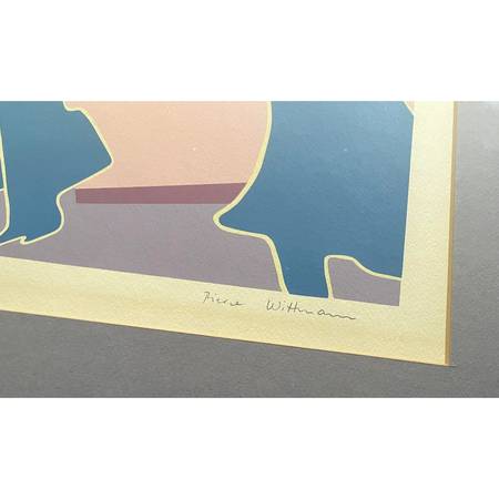 If you love modern or post modern art, take a look. This sci fi-esque rendering might remind you of the Twighlight Zone with impersonal depictions of humanoids making their way through an airport? Depicts blue silhouette figures in a hall way made of color blocks of blues, purples and pinks. Professionally framed in silver metal frame with a lavender matting under glass. Measure approximately 18.5 x 23. Circa 1970s - 80s. Ready to hang.