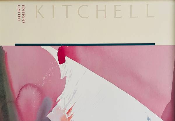 1980s framed abstract lithograph on poster board by listed artist Peter Kitchell. Modernist composition in blue, green, and red. Presented in a brass toned metal frame, no glass, measures approximately 25" x 39" inches. Ready to hang. Kitchell is know for his large scale abstract watercolors. This piece may have been for an exhibit of his. A large triptych work of his is also for sale thru Marzipan Mummy on this site.