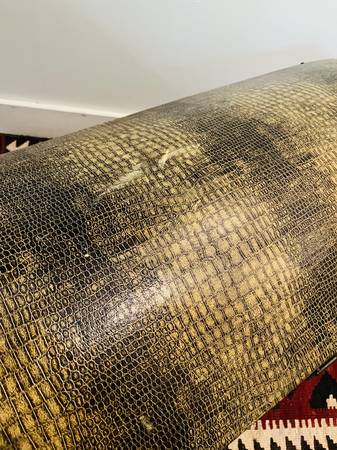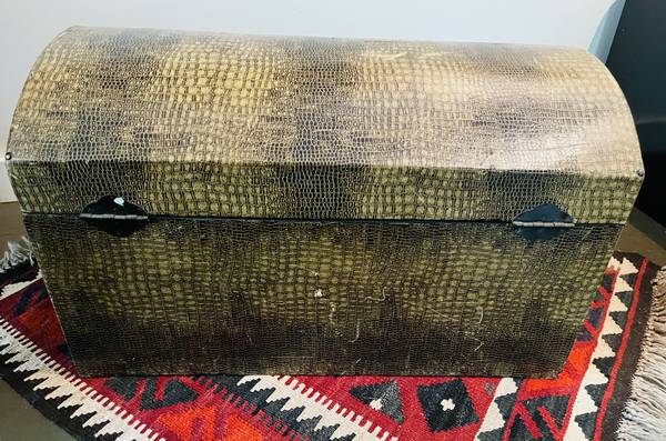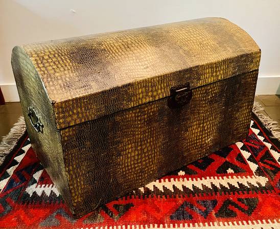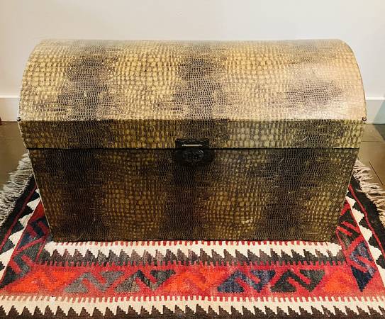 Stylish storage trunk with a faux alligator/crocodile wrap finish. Measures approximately 25.5" x 15.75" x 15" tall. Brass handles both sides for easy transport. Perfect for blankets or your collection of tennis rackets. Wonderful accent piece for any room