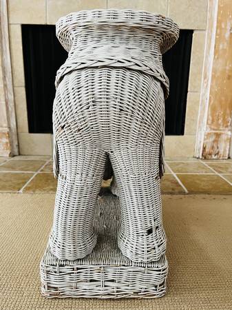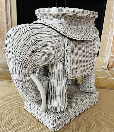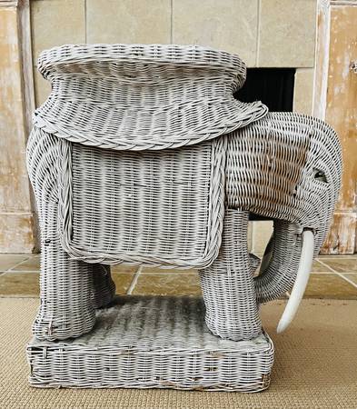 Hailing from the 1970s, this wicker elephant side table is ready to charm. Perfect boho accent. Measures approximately 16" wide x 23" deep x 22" tall. Presents well overall. Some paint loss on one...