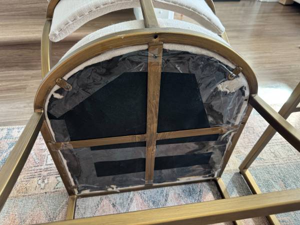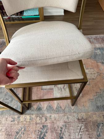 Matte brass frame with light beige fabric seat and back. Chair cushion is removable. Very sturdy and comfortable!