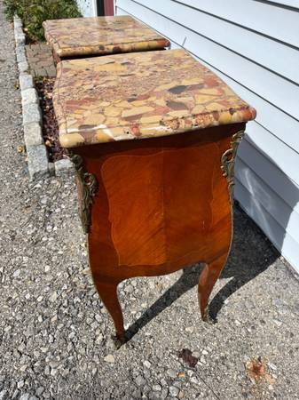 Beautiful pair of tables with inlay and bronze mount accents. Each table: 15" deep, 17" wide, 31" tall. Good condition with minor veneer wear. Price is for the pair.
