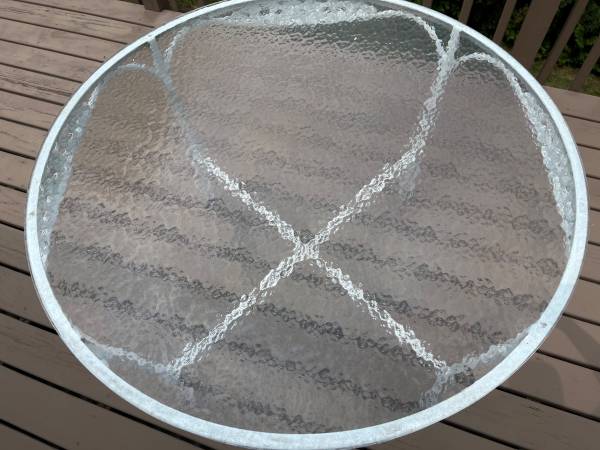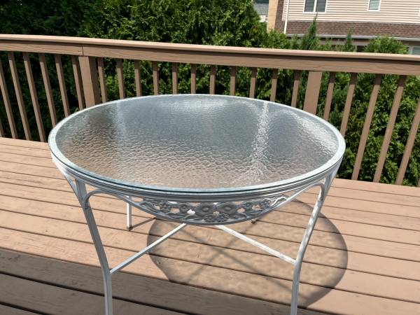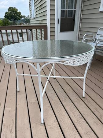 For sale by owner 42 inch diameter round patio table 42 inch diameter Patio table. White metal frame, glass top Available for pick up in Hawthorne, NY Contact seller via CL email relay.