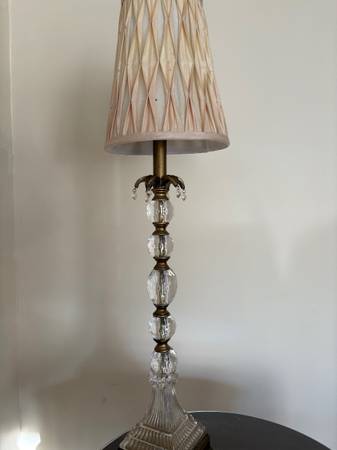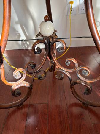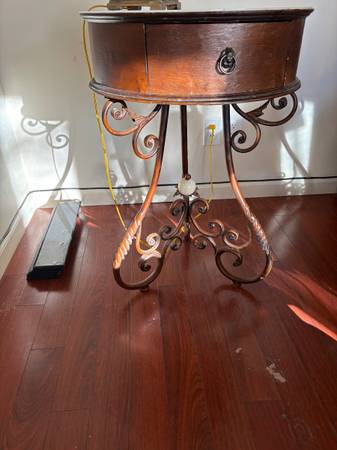 Unique design. Fun table with drawer. Old but sturdy. Wood top. Protective top cover $25 Lamp $10