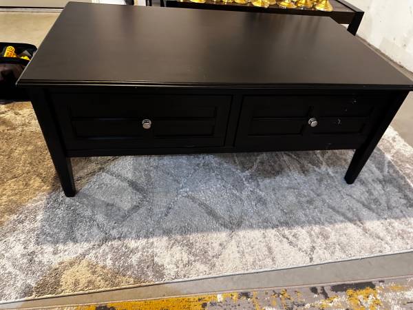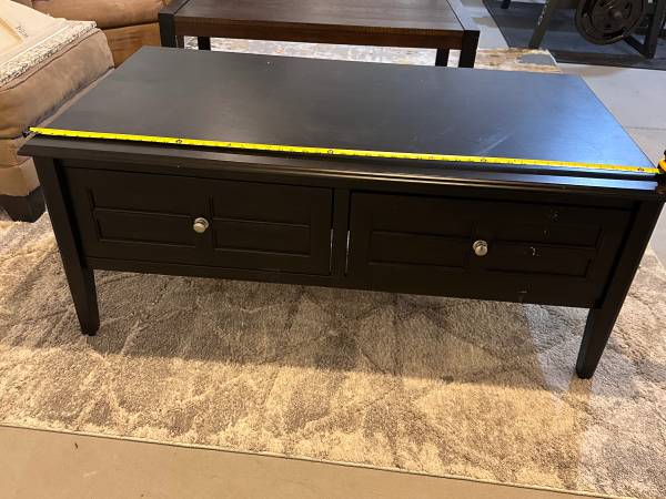 Black coffee table with draws. Very heavy and sturdy. 49.5 in (L) x 28.25in (D)x 20in (H). Pick up and cash only. First come first serve.