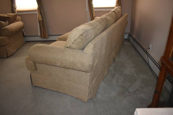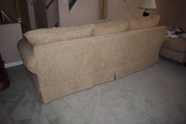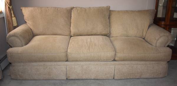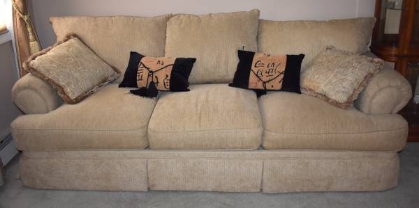 Klaussner full sized beige sofa in excellent condition with 6 removeable plush cushions. 3 T-shaped seat and 3 shaped back cushions, framed with classic rolled arms. A pleated skirt neatly conceals the tapered legs. An extra shaped back cushion is available.