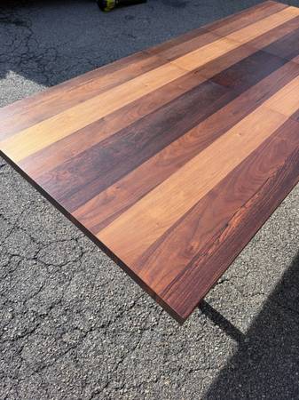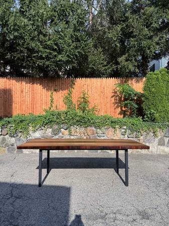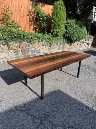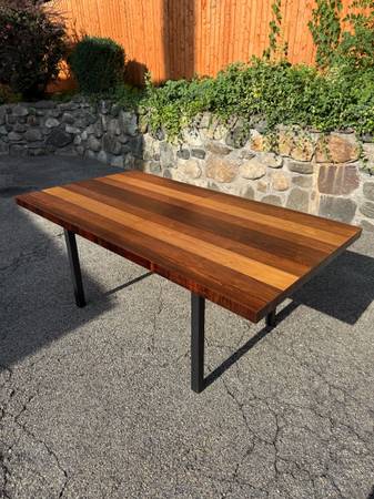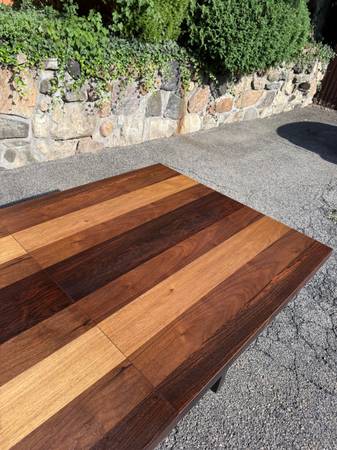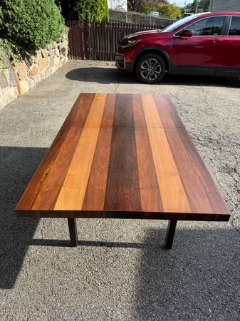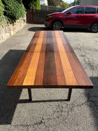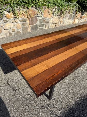 This massive table is crafted from alternating bands of rosewood, walnut, and butternut. It features its original matte-black legs and base, along with two leaves that can extend for larger gatherings, comfortably seating up to eight.