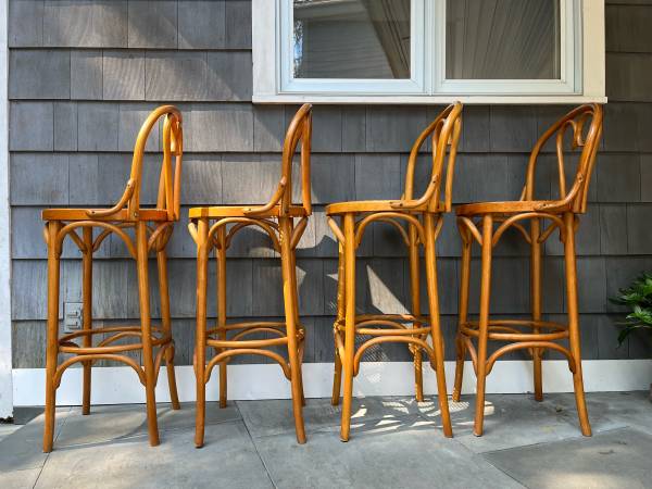 Beautiful bent wood stools with caned seats. Made in Romania Set of 4 There is a tear in the caning on one of the stools. The other three are good. Measures: 29.5 high 16” seat