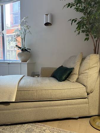 Original Owner, lightly used Arhaus Landsbury Sofa Main Piece: L 63" x W 40" x H19" Chaise Piece: L 61" x W 36" x H 19" Arhaus Butler Coffee Table and Two Removable Tray: 38" x 38" x 16
