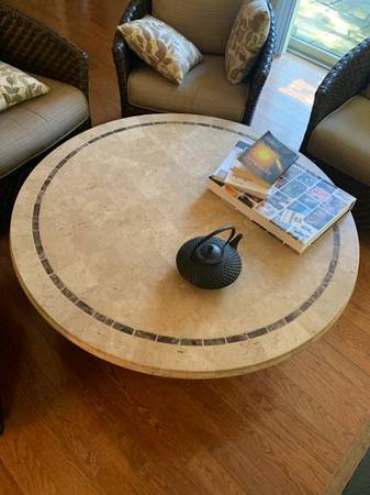 4 Swivel gliding rockers with cushions and 4 decroative pillows. Cushion fabrid is resistant to stains, mildew, chlorine and fading. Steel seat frame. Handcrafted travertine tabletop with slate...