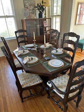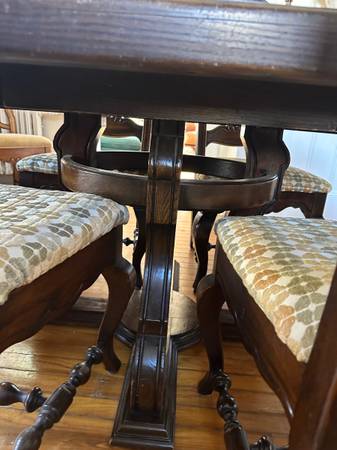 Beautiful solid wood dining set, just decided it’s time to change to a lighter wood for our dining room. Includes table, 2 leaves, and 6 chairs recently reupholstered. Table and chairs are in decent condition but show their age, some dings and dents here and there. Lovely vintage look.