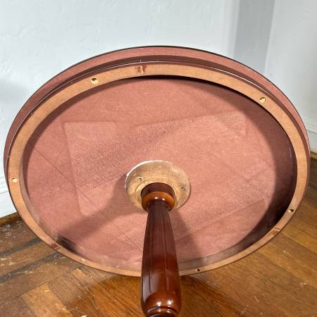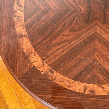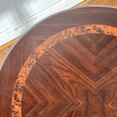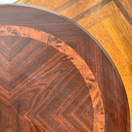 Round pedestal table featuring a wooden inlaid design on top, and a base supported by three curved legs. - h. 23 x dia. 21.5 in.