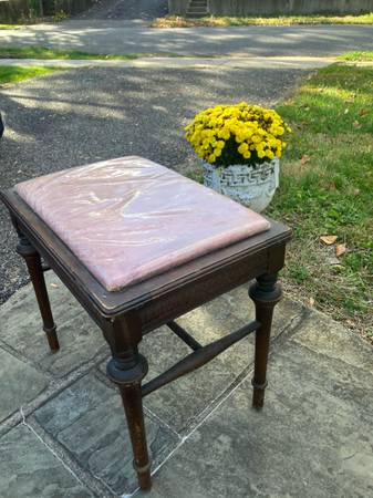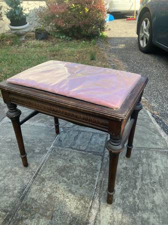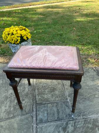 Nice solid bench ready for refinish or painting. Lovely detail edge border, sculpted legs and good condition cane seat with attached cushioned top fabric covered seat, plastic removed. 14” x 20.5” x...